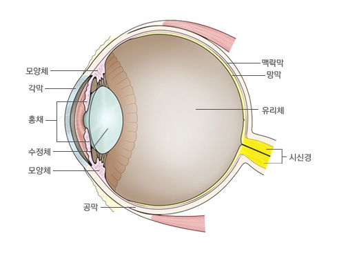 각막은 신체에서 가장 민감한 조직 중 하나로, 평균 직경이 약 11.5mm, 두께가 약 0.5mm 정도의 투명한 돔 형태를 하고 있습니다. 각막에는 혈관이 없어 산소와 영양분을 눈물과 방수로부터 공급받습니다.